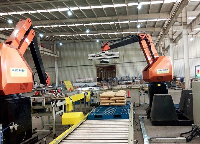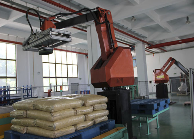 码垛机是将装入编织袋的物料或者是经过包装和未经包装的规则物品,按一定排列码放在托盘(木质)上,进行自动堆码,可堆码多层,然后推出,便于继续进行下一步包装或者叉车运至仓库储存。码垛机实现智能化操作管理,可大大地减少劳动人员和降低劳动强度。