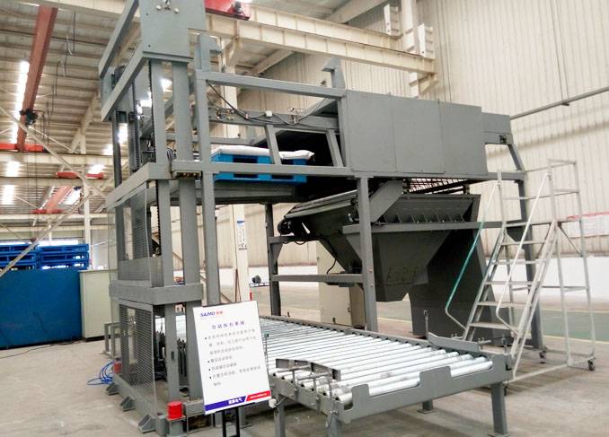 用于将板结的料袋振打、碎料、疏松板结物,同时能将上层料袋整平。以便抓取装置能顺利抓取料袋。该装置由振动框架、9台振动电机、尖锥振动板组成配置有检测装置。能检测到料袋达振动位置。通过PLC控制振动周期及次数。