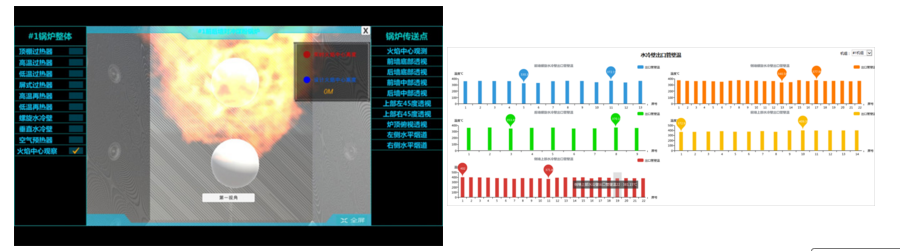 缩进进行锅炉主要设备三维建模虚拟化,实现炉膛燃烧过程 3D 可视化,提供受热面壁温分布情况三维展示,实时监视机组热负荷中心变化,在线计算锅炉效率,定量进行锅炉运行经济性能分析。