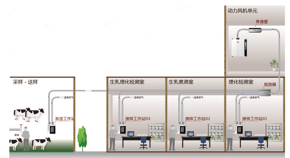 原奶采集后,采集原奶样品通过气动管道传输系统送人实验室。为保证物流方案更符合原奶传输的需求,积硕科技采用收发工作站双管道设计,实现采样区与化验室之间空气相互隔离,满足化验室无菌操作的要求。此外,方案中增加系统内自动排气功能。传输系统控制风机先吹扫管道内的遗留空气,再启动原奶运送,从细节处降低空气交叉感染的几率。
